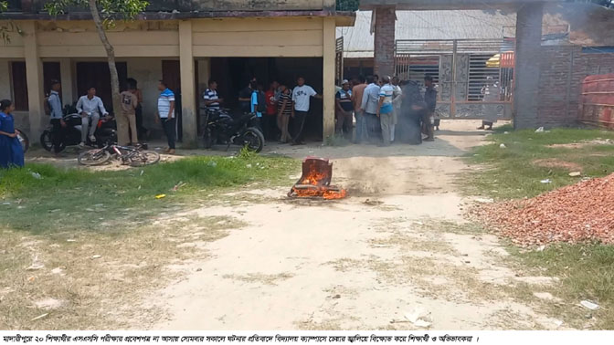জানা যায়, মাদারীপুর সদর উপজেলার মোস্তফাপুর বহুমুখী উচ্চ বিদ্যালয়ে মূল্যায়ন পরীক্ষায় দুই বিষয়ে ফেল করে ২০ শিক্ষার্থী। তাদেরকে এসএসসি পরীক্ষায় অংশগ্রহনের আশ^াস দিয়ে বিদ্যালয়ের খন্ডকালীন সহকারী শিক্ষক সোহেল মোড়ল ও অফিস সহায়ক নুর আলম লিটন জনপ্রতি ১৫ হাজার টাকা করে নেয়। ফরম পূরনের জন্য শিক্ষার্থীদের কাছ থেকে নেয়া ৩ লাখ টাকা ব্যাংকে জমা দেয়নি সহকারী শিক্ষক কিংবা অফিস সহায়ক। ফলে আসেনি ওই ২০ শিক্ষার্থীর এসএসসি পরীক্ষার প্রবেশপত্র। বিষয়টি জানতে পেরে সোমবার সকালে বিদ্যালয় মাঠে জড়ো হয় শিক্ষার্থী ও অভিভাবকরা। অভিযুক্তদের বিচার দাবীতে শুরু হয় আন্দোলন। খবর পয়ে ঘটনাস্থলে এসে প্রায় আড়াই ঘন্টা পর পরিস্থিতি নিয়ন্ত্রনে আনেন উপজেলা প্রশাসন।
